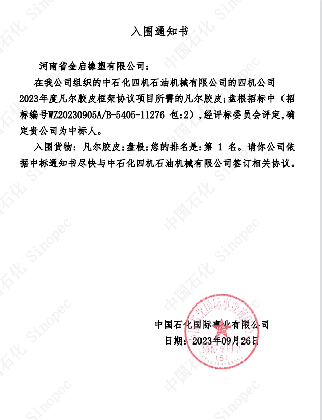 入围货物:凡尔胶皮;盘根 您的排名是:第1名。请你公司依据入围通知书尽快与中石化四机石油机械有限公司签订合同。