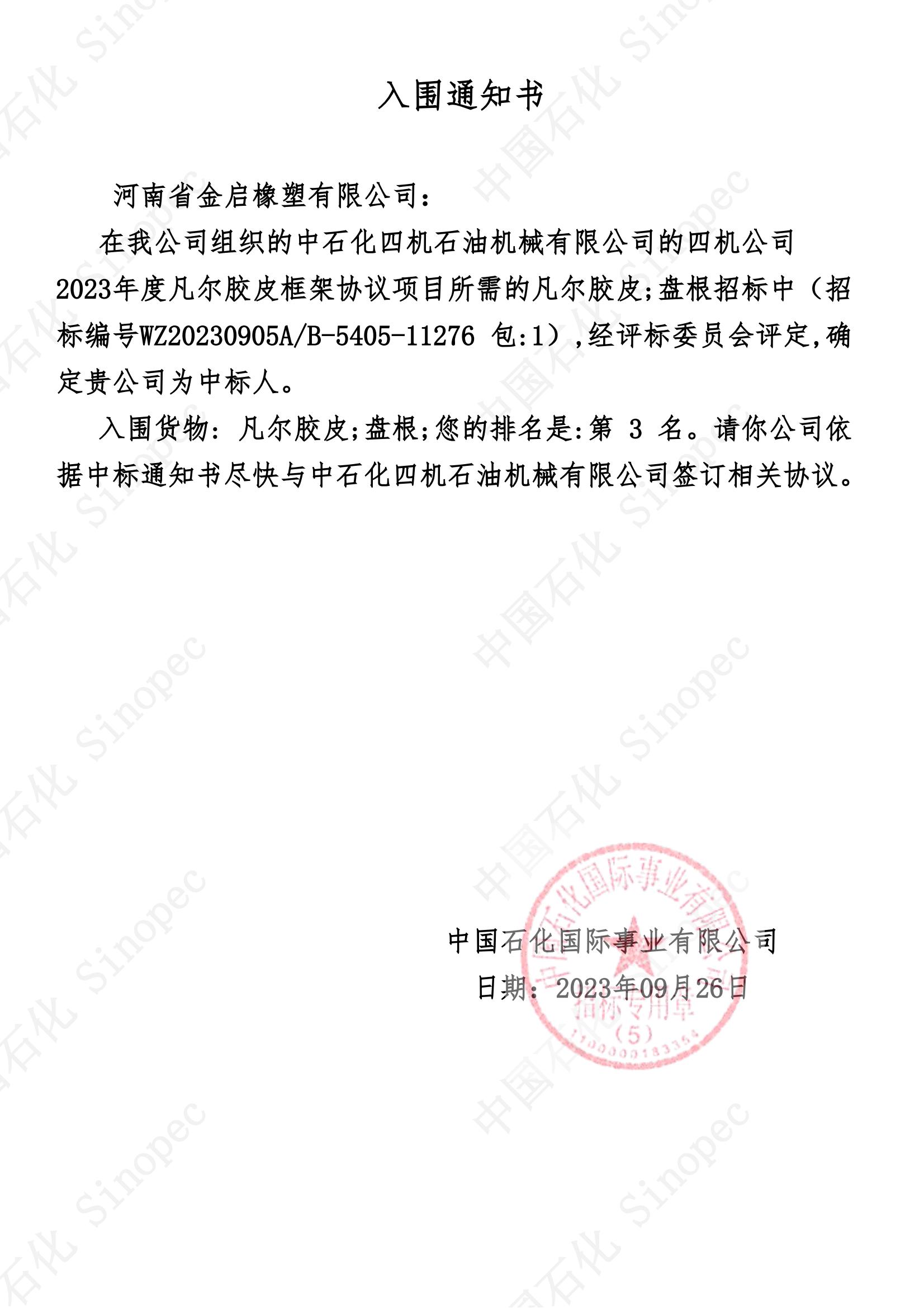 在我公司组织的中石化四机石油机械有限公司的四机公司2023年度凡尔胶皮框架协议所需的凡尔胶皮;盘根招标中(招标编号:WZ20230905A/B-5405-11276 包:1),经评标委员会评审,确定贵公司为入围人。