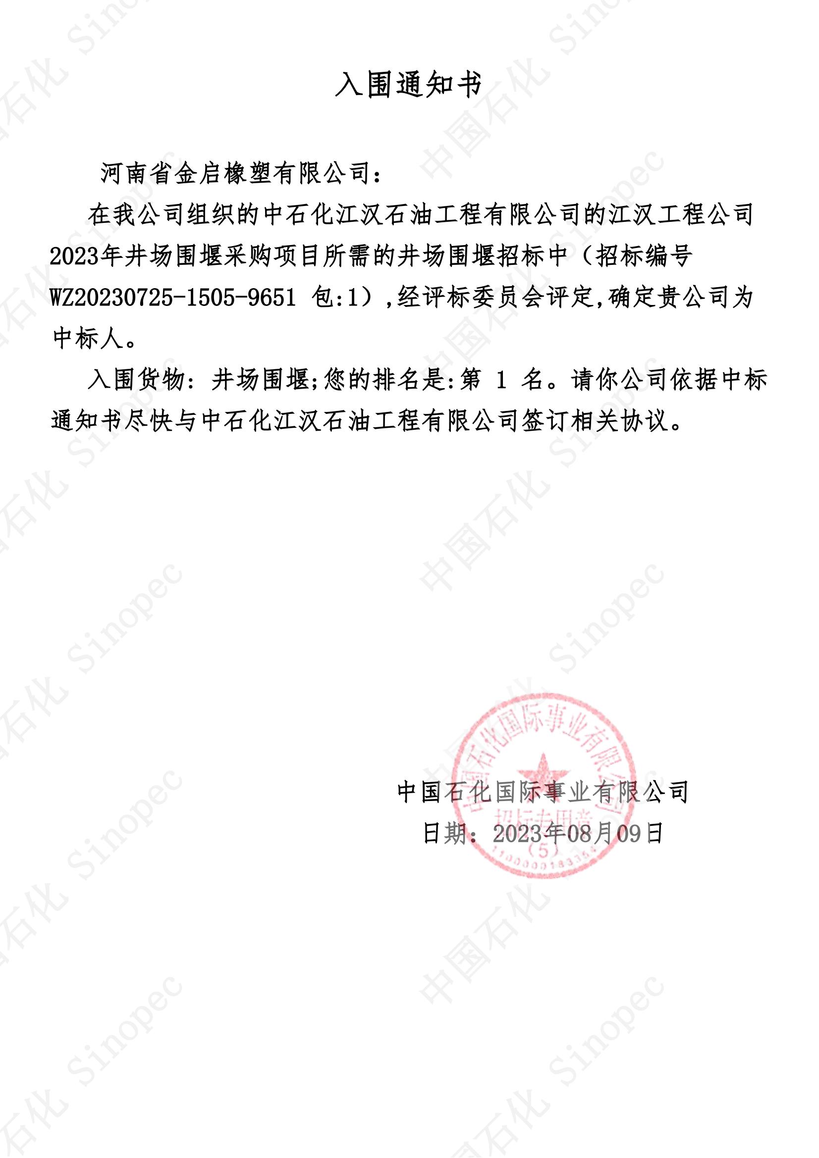 在我公司组织的中石化江汉石油工程有限公司的江汉工程公司2023年井场围堰采购所需的井场围堰招标中(招标编号:WZ20230725-1505-9651 包:1),经评标委员会评定,确定贵公司为中标方。中标货物:井场围堰 请你公司依据中标通知书尽快与中石化江汉石油工程有限公司签订合同。